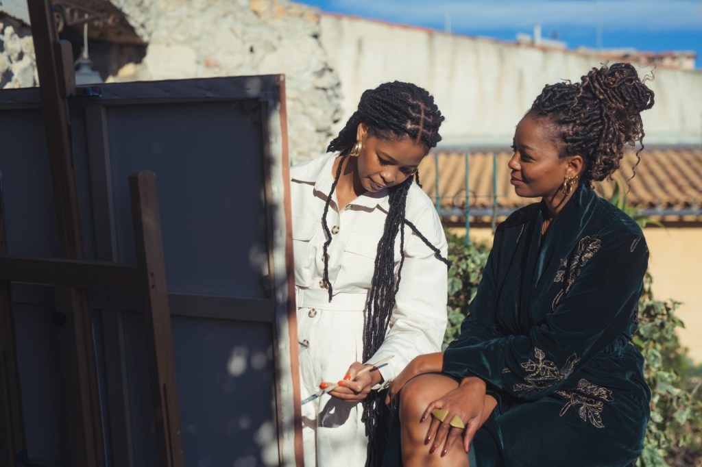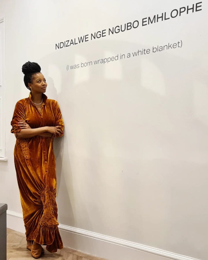 We turn into what would’ve been the living room and in it stands an icon in the South African art industry, Nomaza Nongqunga Coupez, draped in copper-orange velvet. The France-based entrepreneur and founder of Undiscovered Canvas, with a focus on “promoting investment in African arts”, greets us wholeheartedly. The girl had a split second to decide who I’d be in this narrative, but fangirl and hype-woman be my original nature! I Marylebonically, black-girl-in-an-art-gallery, lost my mind. She gracefully talks us through some of the pieces she’s curated for this exhibition. Her pride is that of a midwife, holding a new born in the air.