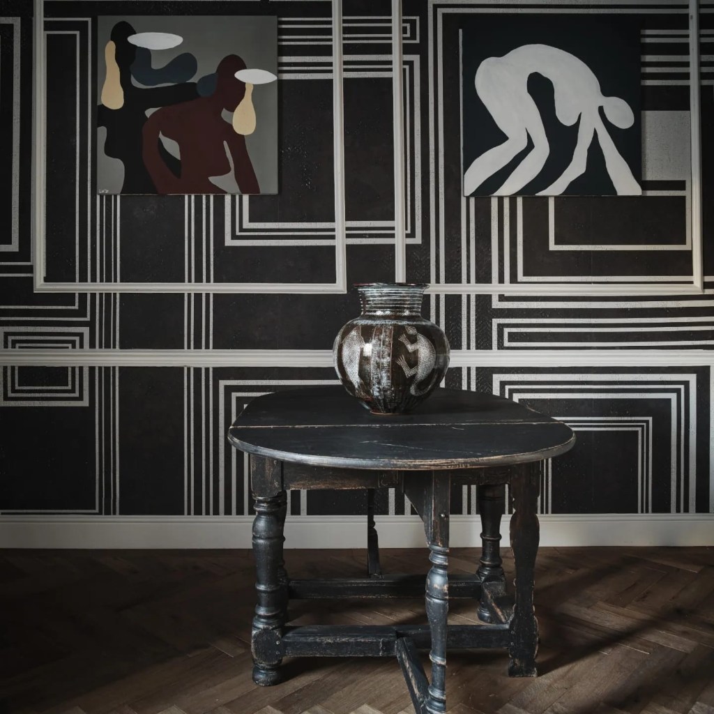 The door is opened by a tall, beautiful woman, with a dreadlocked ponytail, who welcomes us with homely ease. The gallery, at first sight, looks like its former life, a Georgian Marylebone white terraced home. This style of display is a far echo from the white-walled gallery norm. Instead, the works hang against floor-to-ceiling geometric walls. The featured pieces of contemporary furniture give the art a familial and intimate poise, making the majestic attainable, liveable.